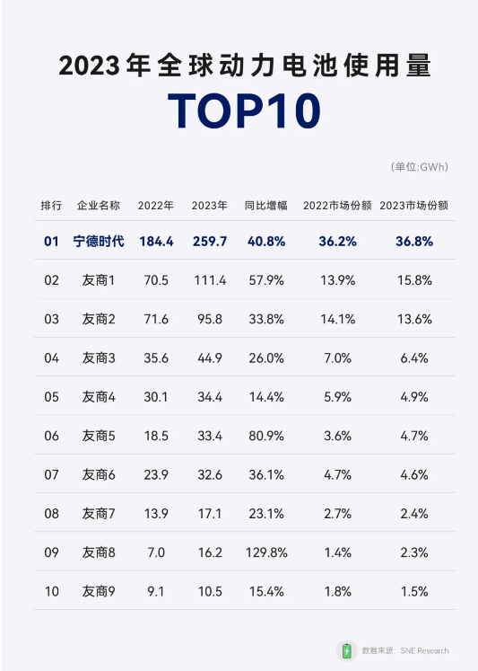 另?yè)?jù)CATL寧德時(shí)代官方微信號(hào),近日,韓國(guó)電池和能源研究公司SNE Research發(fā)布了2023年全球動(dòng)力電池使用數(shù)據(jù),寧德時(shí)代連續(xù)7年,登頂全球第一。