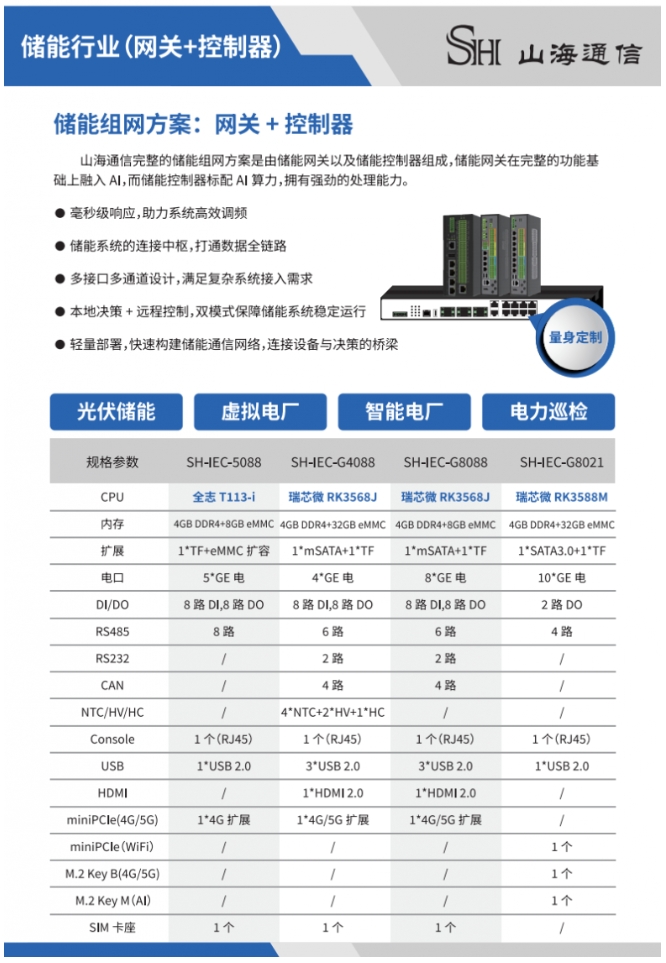 山海通信完整的儲能組網方案是由儲能網關以及儲能控制器組成,儲能網關在完整的功能基礎上融入 A,而儲能控制器標配 AI算力,擁有強勁的處理能力。