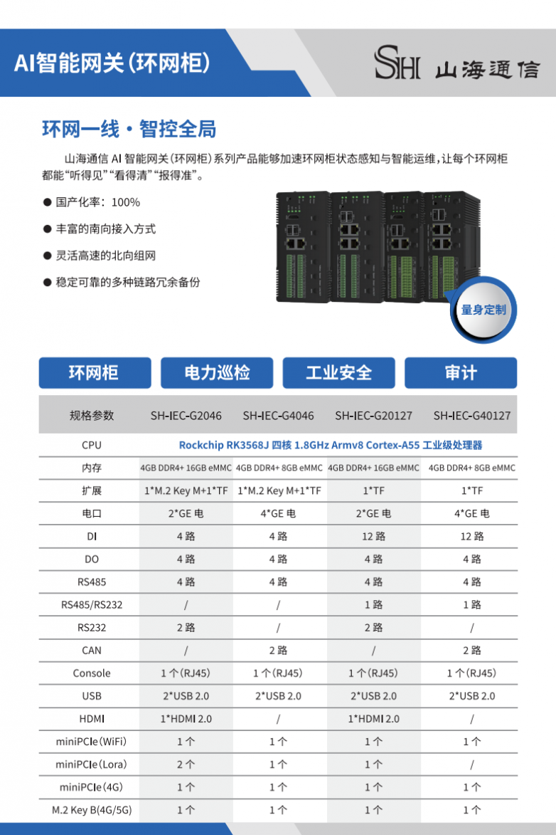 山海通信 AI智能網關(環(huán)網柜)系列產品能夠加速環(huán)網柜狀態(tài)感知與智能運維,讓每個環(huán)網柜都能“聽得見”“看得清”“報得準”。