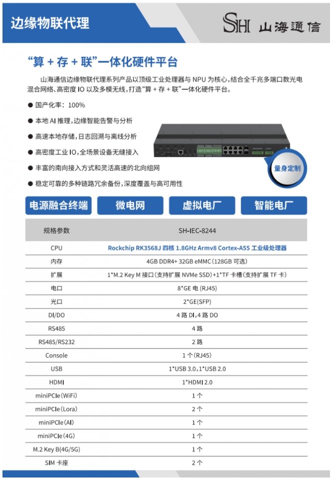 山海通信邊緣物聯(lián)代理系列產品以頂級工業(yè)處理器與 NPU為核心,結合全千兆多端口數光電混合網絡、高密度IO以及多模無線,打造“算+存+聯(lián)”一體化硬件平臺。