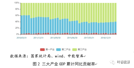 分產(chǎn)業(yè)看,10余年來,隨著我國經(jīng)濟(jì)結(jié)構(gòu)的轉(zhuǎn)型,三大產(chǎn)業(yè)對(duì)GDP的貢獻(xiàn)率發(fā)生明顯變化。2010至2019年,第三產(chǎn)業(yè)GDP貢獻(xiàn)率由39.7%上升至59.4%,增加接近20個(gè)百分點(diǎn);第二產(chǎn)業(yè)GDP貢獻(xiàn)率由58.6%降至36.8%,下降21.8個(gè)百分點(diǎn)。三大產(chǎn)業(yè)貢獻(xiàn)率格局基本穩(wěn)定,第三產(chǎn)業(yè)成為拉動(dòng)GDP的生力軍,其占比上升5.7個(gè)百分點(diǎn);二產(chǎn)占比下降6.6個(gè)百分點(diǎn)。2019年,第三產(chǎn)業(yè)和城鄉(xiāng)居民生活用電量對(duì)全社會(huì)用電量增長的貢獻(xiàn)率達(dá)51.0%,比上年提高11.1個(gè)百分點(diǎn),其中第三產(chǎn)業(yè)貢獻(xiàn)率比上年提高10.1個(gè)百分點(diǎn),是支撐全社會(huì)用電量增長的主要?jiǎng)恿Α?/p>