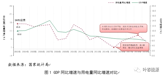 用電量與GDP增速具有較強(qiáng)的相關(guān)性。從GDP與用電量增速對(duì)比曲線圖可以看出,2003-2019年二者用電量走勢基本一致。2015年和2018年二者有些背離,一方面是經(jīng)濟(jì)增速進(jìn)入換擋期,動(dòng)力轉(zhuǎn)換;另一方面是二者統(tǒng)計(jì)指標(biāo)調(diào)整時(shí)間上有些不一致。