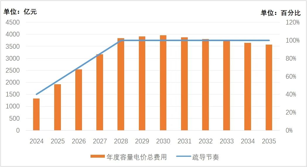 圖2 年度容量電價(jià)總費(fèi)用及疏導(dǎo)節(jié)奏(按趨勢預(yù)估測算)