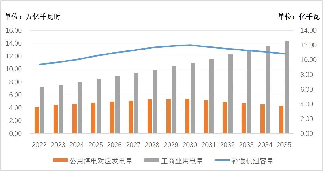 圖1 公用煤電對應(yīng)發(fā)電量及工商業(yè)用電量、補(bǔ)償機(jī)組容量預(yù)測趨勢(未來年度數(shù)據(jù)為作者個人分析預(yù)測值,其中煤電容量數(shù)據(jù)為年內(nèi)平均值而非期末時(shí)點(diǎn)值)