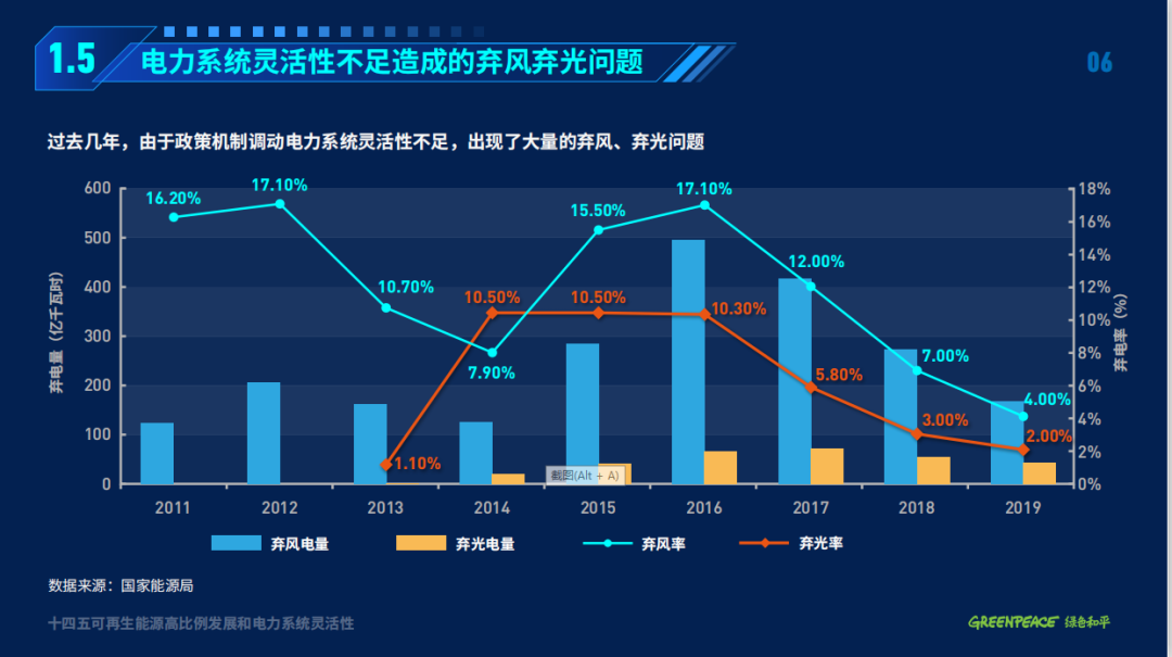 目前,中國以煤電為主的電力系統(tǒng)靈活性嚴(yán)重不足,電力系統(tǒng)的僵化導(dǎo)致了棄風(fēng)、棄光問題的出現(xiàn)。2011-2019年,中國的棄風(fēng)和棄光率一度高達17.1%和10.5%,造成了大量發(fā)電資源的浪費。2016-2018年間,中國棄風(fēng)和棄光電量共計1389億千瓦時 ,相當(dāng)于約3000萬千瓦煤電廠的發(fā)電量。
