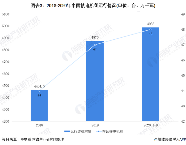 截至2019年底,中國(guó)在運(yùn)核電機(jī)組共47臺(tái),分別位于8個(gè)沿海省份的13個(gè)核電基地中,運(yùn)行裝機(jī)容量達(dá)到4875萬千瓦,位居世界第三,占全國(guó)總裝機(jī)容量的2.5%左右。截止2020年9月底,中國(guó)在運(yùn)核電機(jī)組48臺(tái),總裝機(jī)容量4988萬千瓦。