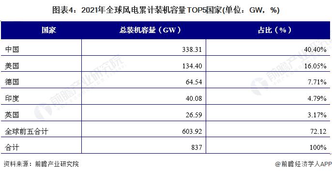 截至 2021 年底,全球風(fēng)電裝機(jī)總量 837GW,其中中國(guó)位居第一,裝機(jī)總量達(dá) 338.31GW,占世界總裝機(jī)容量的 40.40%; 美國(guó)風(fēng)電裝機(jī)總量為 134.40GW,占比為 16.05%,僅次于中國(guó) ; 德國(guó)雖然在 2021 年新增裝機(jī)容量不是很多,但作為老牌風(fēng)電強(qiáng)國(guó),累計(jì)裝機(jī)容量仍占了第三的位置,風(fēng)電裝機(jī)總量 64.54GW,占比 7.71%。印度和英國(guó)的裝機(jī)總量分別為 40.08GW 和 26.59GW,分別占比 4.79% 和 3.17%。中國(guó)和美國(guó)風(fēng)電累計(jì)裝機(jī)量占世界總裝機(jī)量的比例超過(guò) 50%,前五的國(guó)家占比超過(guò) 70%。