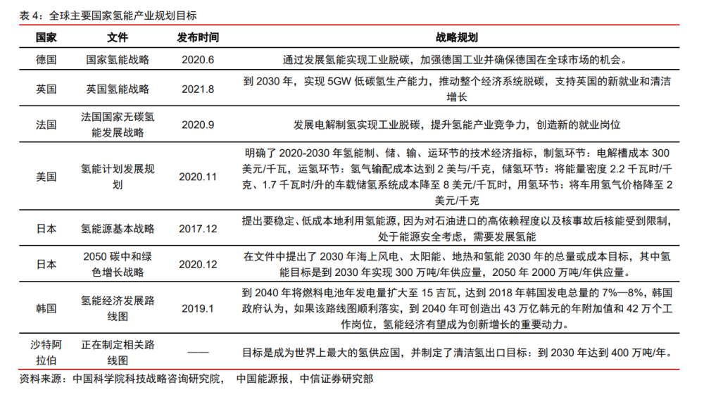 全球氫能發(fā)展相對(duì)領(lǐng)先的地區(qū)有美國、歐洲、日韓,而沙特阿拉伯、阿聯(lián)酋等中東國家也瞄準(zhǔn)了氫能,沙特阿拉伯雖未發(fā)表書面文件,但是已經(jīng)提出了氫能戰(zhàn)略目標(biāo)。