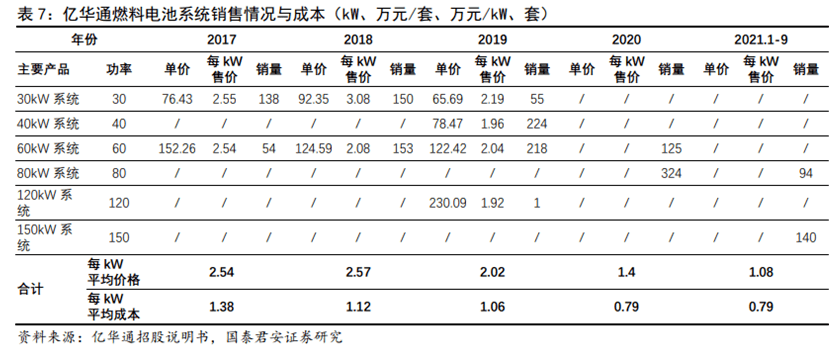 電堆的降本之路:據(jù)GGII統(tǒng)計,電堆近年的降價幅度約為每年30%。與此同時,氫燃料電池系統(tǒng)的平均降價幅度約為每年15%。2021年,批量采購的電堆價格已降至2000元/kW以下,這也使得燃料電池系統(tǒng)價格低于5000元/kW成為可能。