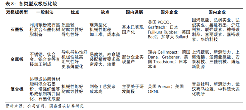雙極板(BP):依材質(zhì)可分為石墨雙極板、金屬雙極板和復合雙極板。氫燃料電池目前主要采用石墨板或金屬板,釩液流電池傾向復合板。國產(chǎn)化進程方面,石墨板基本已實現(xiàn)國產(chǎn)化,金屬板已有部分企業(yè)實現(xiàn)量產(chǎn),復合板尚處研發(fā)階段。