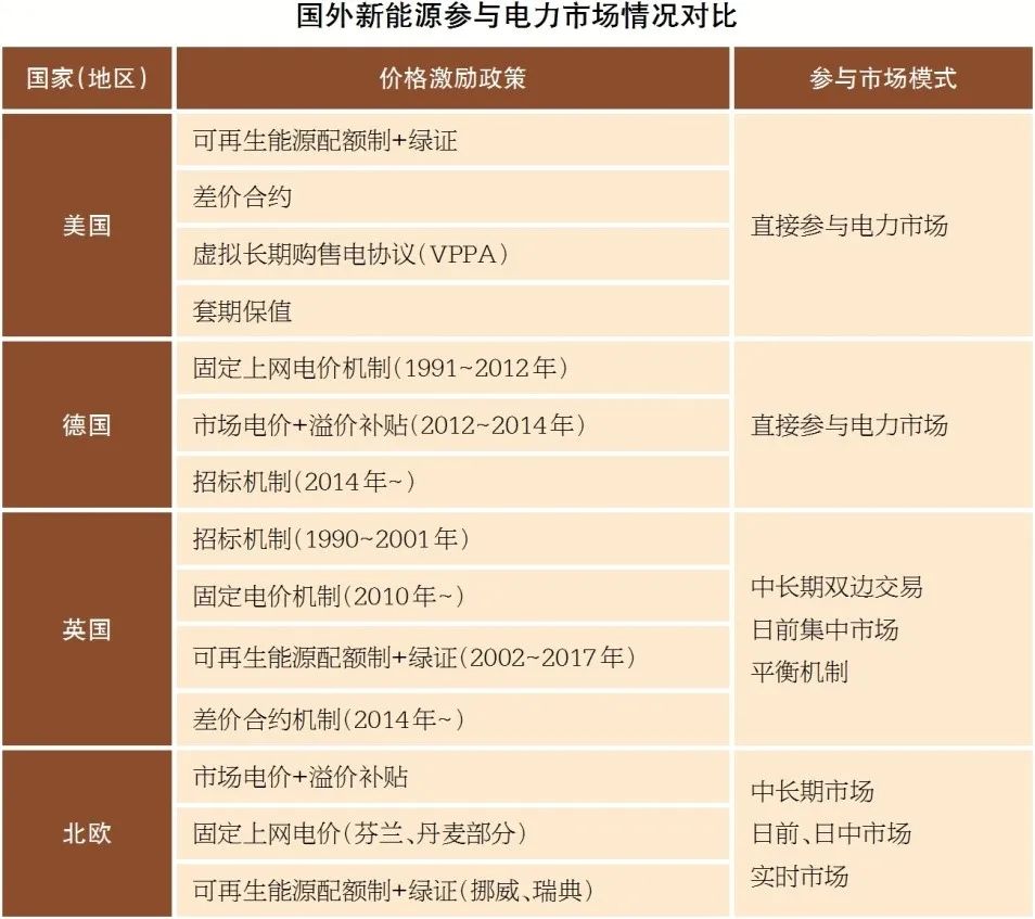 一是發(fā)揮政策補償激勵作用,促進新能源發(fā)展。國外新能源參與電力市場往往不考慮新能源的特殊性,與其他市場主體一樣,平等參與電力市場交易,但是會配套建立額外的政策措施,保障可再生能源發(fā)電的合理收益。例如美國新能源基于可再生能源配額制及其配套綠證機制、差價合約、VPPA及套期保值等價格激勵機制參與電力市場;德國基于溢價機制和招標(biāo)機制等參與電力市場。通過配額制和綠證的機制體現(xiàn)新能源綠色價值,是國際通用的做法,從而保障新能源參與電力市場的收益。