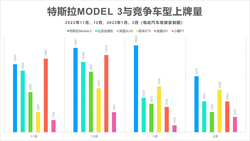 通過 1 月份 4 萬元左右的降幅,Model Y 在 2 月份開始回到 " 月銷 3 萬 " 的趨勢當(dāng)中,并對競爭對手產(chǎn)生了連鎖反應(yīng):
