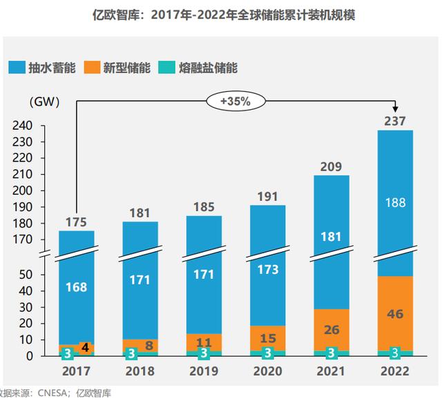 根據(jù)CNESA數(shù)據(jù),截至2021年底,全球已投運(yùn)的(電力)儲(chǔ)能項(xiàng)目累計(jì)裝機(jī)規(guī)模 209.4GW,相較于五年前增長(zhǎng)19%。抽水蓄能占比高,漲幅較小;儲(chǔ)能的增長(zhǎng)幾乎全部來(lái)自于新型儲(chǔ)能,五年間占比已達(dá)12.2%。其中電化學(xué)儲(chǔ)能為增長(zhǎng)主力軍,從2017年的2.9GW增長(zhǎng)至如今的23GW,占據(jù)新型儲(chǔ)能市場(chǎng)90%以上的份額。