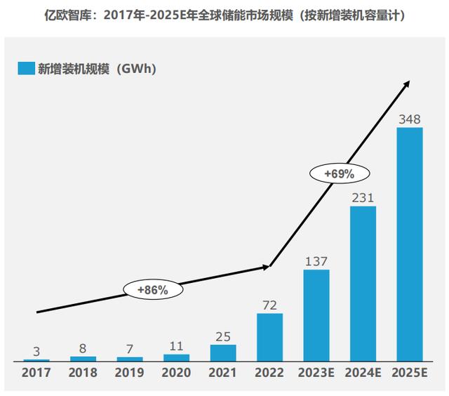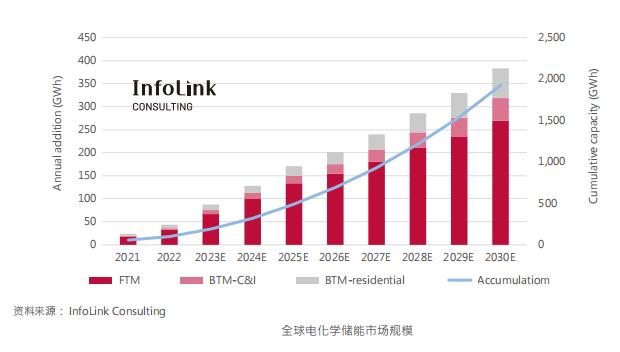 根據(jù)InfoLink資料庫(kù)統(tǒng)計(jì),2022年全球電化學(xué)儲(chǔ)能新增16.2GW/44GWh,其中以中國(guó)新增約34%占整體成長(zhǎng)速度最快,其次為美國(guó)、歐洲、日本、韓國(guó)、澳大利亞等,光是上述國(guó)家2022年儲(chǔ)能新增總和占全球超過(guò)市場(chǎng)九成份額,因此累計(jì)至2022年底,電化學(xué)儲(chǔ)能全球累計(jì)安裝量為41GW/98.8GWh,之中約有16-17GWh搭配光伏系統(tǒng),InfoLink估計(jì)光加儲(chǔ)占比將會(huì)因政策及再生能源發(fā)展而逐年提升比重,此外,盡管現(xiàn)在儲(chǔ)能增長(zhǎng)速度每年已經(jīng)以倍數(shù)成長(zhǎng),估計(jì)到2025年國(guó)際電芯廠紛紛擴(kuò)產(chǎn)之后,儲(chǔ)能系統(tǒng)會(huì)因電池價(jià)格下降因而再加速建置速度,預(yù)計(jì)2025年全球電化學(xué)儲(chǔ)能市場(chǎng)有望超過(guò)100GWh,而2030年全球樂(lè)觀有望累積建置 250GWh。