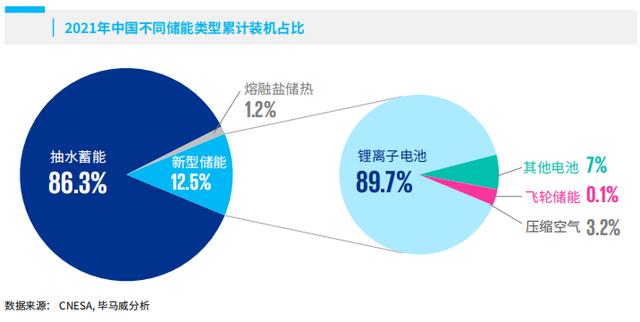 根據(jù)CNESA數(shù)據(jù),2021年中國(guó)儲(chǔ)能市場(chǎng)中不同類型儲(chǔ)能方式的占比與全球基本保持一致。其中抽水蓄能仍是最主要的儲(chǔ)能方式,占比86.3%,與全球86.2%的占比持平;但抽水蓄能電站的建設(shè)受地形因素限制較大,且建設(shè)周期較長(zhǎng),通常需要7年左右,未來(lái)隨著電化學(xué)儲(chǔ)能等新型儲(chǔ)能造價(jià)的下降,抽水蓄能在電力系統(tǒng)中的發(fā)展空間可能受限。新型儲(chǔ)能方式占比12.5%,高于全球0.3個(gè)百分點(diǎn)。電化學(xué)儲(chǔ)能為最主要的新型儲(chǔ)能方式,占比96.7%,比全球占比略低一個(gè)百分點(diǎn),鋰離子電池占據(jù)主流。