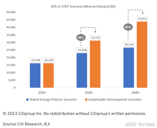 上面的圖表突出了既定能源政策(STEP)和可持續(xù)發(fā)展(SDS)情景下的礦物需求。在2030年和2040年,這兩種情景之間存在顯著差異,既定能源政策情景下的需求分別比可持續(xù)發(fā)展情境下低36%和65%。