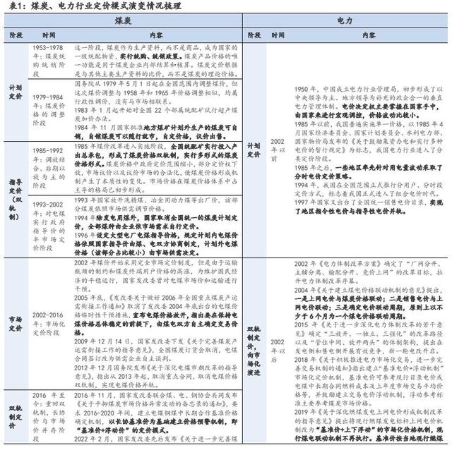 煤電矛盾的本質(zhì)是煤、電定價(jià)機(jī)制市場(chǎng)化程度不同。煤炭定價(jià)方面,2016 年以前我國煤炭?jī)r(jià)格經(jīng)歷了計(jì)劃價(jià)格、指導(dǎo)價(jià)格、市場(chǎng)價(jià)格等多種定價(jià)機(jī)制。2016 年末國家發(fā)改委聯(lián)合煤、電、鋼協(xié)會(huì)共同發(fā)布《關(guān)于平抑煤炭市場(chǎng)價(jià)格異常波動(dòng)的備忘錄的通知》,要求 2016-2020 年間,建立電煤鋼煤中長(zhǎng)期合作基準(zhǔn)價(jià)格確定機(jī)制,以長(zhǎng)協(xié)基準(zhǔn)價(jià)為基礎(chǔ)建立價(jià)格預(yù)警機(jī)制,即“基準(zhǔn)價(jià)+浮動(dòng)價(jià)”的定價(jià)模式。電力定價(jià)方面,2015 年國家開啟電力定價(jià)機(jī)制市場(chǎng)化改革,2020 年取消“煤電聯(lián)動(dòng)”機(jī)制,同時(shí)將燃煤發(fā)電標(biāo)桿上網(wǎng)電價(jià)機(jī)制改為“基準(zhǔn)價(jià)+上下浮動(dòng)”的市場(chǎng)化價(jià)格機(jī)制,基準(zhǔn)價(jià)格設(shè)定權(quán)下放至地方政府,浮動(dòng)幅度由電力用戶等市場(chǎng)主體協(xié)商決定。