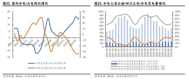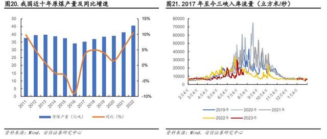 確保能源安全穩(wěn)定供應(yīng),煤電扛起保供重任。2023 年 4 月《2023 年能源工作指導(dǎo)意見》發(fā)布,不同于 2021 年指導(dǎo)意見中將“能源結(jié)構(gòu)”放在了目標(biāo)首位,國家能源局已經(jīng)連續(xù)兩年堅(jiān)持把“增強(qiáng)供應(yīng)保障能力”放在主要目標(biāo)首位。由此可見,自 2021 年起頻發(fā)的缺電事件使人們意識(shí)到能源保供需求刻不容緩,而我國以煤為主的資源稟賦,決定了煤電在相當(dāng)長(zhǎng)時(shí)期內(nèi)仍將承擔(dān)保障我國能源安全的重要作用。從數(shù)據(jù)來看,煤炭方面,在能源保供要求下國家通過核增產(chǎn)能、擴(kuò)產(chǎn)、新投產(chǎn)等方式持續(xù)新增煤炭產(chǎn)能,據(jù)國家統(tǒng)計(jì)局,2022 年我國實(shí)現(xiàn)煤炭產(chǎn)量 45.6 億噸,同比增長(zhǎng) 10.5%,為近十年來最高增速。煤電方面,去年夏季以來,降水偏枯造成水電發(fā)電量持續(xù)出力不足,2022 年下半年至 2023 年上半年三峽水庫日均流入量為近五年來同期低位,據(jù)國家統(tǒng)計(jì)局,2023 年 1-6 月我國水力發(fā)電量同比下降 22.9%。為彌補(bǔ)水力發(fā)電不足,2023 年 1-6 月我國火力絕對(duì)發(fā)電量達(dá)到 29457 億千瓦時(shí),同比增長(zhǎng) 7.5%,占上半年總發(fā)電量的 71%。