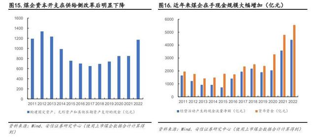 “雙碳”目標(biāo)下,煤企轉(zhuǎn)型具備先天產(chǎn)業(yè)優(yōu)勢(shì)、地域優(yōu)勢(shì)且資金充足。一方面,煤企具有產(chǎn)業(yè)優(yōu)勢(shì),具備能源開采、裝備制造的成熟經(jīng)驗(yàn),擁有穩(wěn)定的下游電廠、化工客源,以及先天地域優(yōu)勢(shì)。我國大型新能源項(xiàng)目基地多數(shù)位于西北地區(qū),與煤炭資源分布重合度較高,如我國第一批容量約 1 億千瓦的大型風(fēng)電光伏基地主要位于甘肅、青海、內(nèi)蒙、寧夏等西部地區(qū)。此外,與傳統(tǒng)能源相比,新能源占地面積大。隨著新能源規(guī)??焖贁U(kuò)大,土地資源已經(jīng)成為影響新能源發(fā)展的重要因素,煤炭企業(yè)可利用自有采煤沉陷區(qū)受損土地規(guī)劃建設(shè)光伏發(fā)電、風(fēng)力發(fā)電等新能源項(xiàng)目,提高資源利用率的同時(shí)還可實(shí)現(xiàn)綠色轉(zhuǎn)型。另一方面,受制于 2011-2013 年行業(yè)產(chǎn)能過剩以及 2016 年以來的供給側(cè)結(jié)構(gòu)性改革,煤炭行業(yè)資本開支明顯下降,2021 年至今雖在行業(yè)景氣度好轉(zhuǎn)以及政策鼓勵(lì)保供穩(wěn)價(jià)背景下有所回升,但在“雙碳”目標(biāo)持續(xù)推進(jìn)下,煤炭固定資產(chǎn)投資規(guī)模大、時(shí)間長(zhǎng),資本開支仍低于此前水平,且新礦井的使用時(shí)間一般長(zhǎng)達(dá)數(shù)十年之久,長(zhǎng)期來看與雙碳背景相違背,企業(yè)進(jìn)行煤炭固定資產(chǎn)投資的意愿不強(qiáng)。但近兩年煤價(jià)高位運(yùn)行,使得煤炭企業(yè)盈利能力持續(xù)改善,在手現(xiàn)金規(guī)模大幅增加,為后續(xù)轉(zhuǎn)型提供基礎(chǔ)。