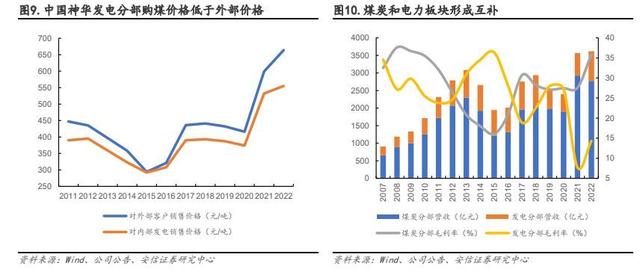 平抑周期波動(dòng)、協(xié)同上下游降本,煤電一體強(qiáng)化業(yè)績(jī)穩(wěn)定性。煤電聯(lián)營可以使煤企和電企建立一種互補(bǔ)的、長(zhǎng)效的利益共享、風(fēng)險(xiǎn)共擔(dān)的機(jī)制,降低因?yàn)槊簝r(jià)波動(dòng)帶來的經(jīng)營風(fēng)險(xiǎn),確保電廠燃料長(zhǎng)期穩(wěn)定供應(yīng)的同時(shí)還可減少中間采購環(huán)節(jié),大幅降低發(fā)電成本并鎖定下游火電利潤。以中國神華為例:1)內(nèi)部降本方面,據(jù)公司年報(bào),2011 年至今中國神華發(fā)電分部80%以上煤炭源于內(nèi)部采購,且采購價(jià)格均低于外部銷售價(jià)格,最大限度降低電廠用煤成本。
