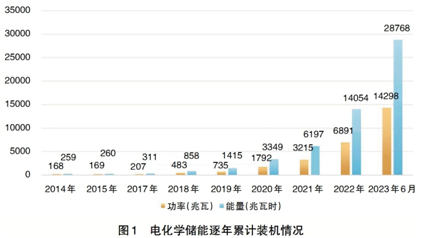 近年來,電化學儲能呈現(xiàn)爆發(fā)式增長,根據(jù)《統(tǒng)計數(shù)據(jù)》,2023年上半年,新增投運電化學儲能電站227座、總功率7.41吉瓦、總能量14.71吉瓦時,新增規(guī)模創(chuàng)歷史新高,超過此前歷年累計裝機規(guī)??偤?見圖1)。此外,目前在建電化學儲能電站325座、總功率12.92吉瓦、總能量30.49吉瓦時,按照電化學儲能電站建設周期一般6~8個月計算,在不計新增項目的情況下,2023年下半年新增裝機規(guī)模也將翻一番,提前兩年完成“十四五”規(guī)劃裝機目標(國家發(fā)改委、國家能源局《關(guān)于加快推動新型儲能發(fā)展的指導意見》中提到,2025年新型儲能裝機規(guī)模達3000萬千瓦以上)。