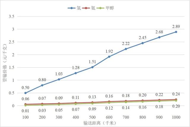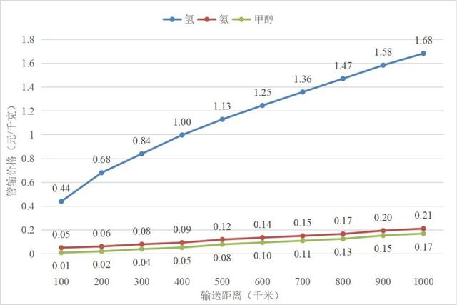 中期階段氫基能源長(zhǎng)距離管輸價(jià)格與輸送距離的關(guān)系圖