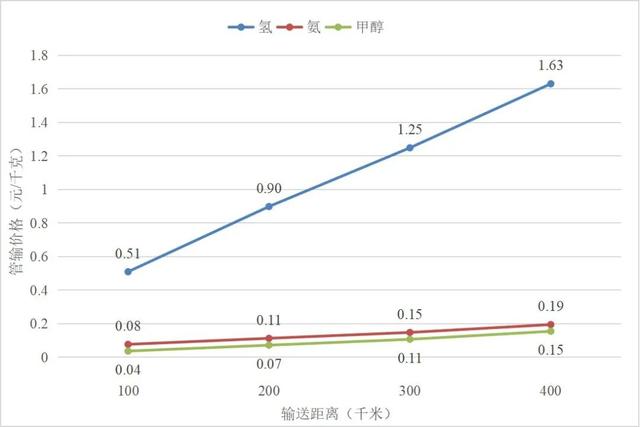 現(xiàn)狀階段氫基能源短距離管輸價(jià)格與輸送距離的關(guān)系圖