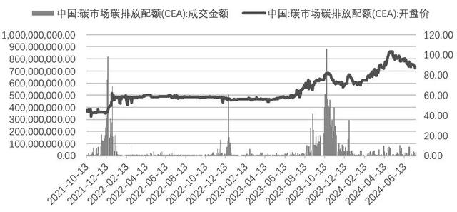 2023年7月16日至2024年7月16日,伴隨著煤電與新能源“兩個(gè)聯(lián)營(yíng)”的深入和“雙碳”目標(biāo)的推進(jìn),加之《碳排放權(quán)交易管理辦法(試行)》審議被提上日程,參與碳排放配額交易的電廠主體越來(lái)越多,碳排放配額價(jià)格出現(xiàn)震蕩上漲走勢(shì),并于2024年4月29日創(chuàng)出104元/噸的歷史新高,當(dāng)日成交量達(dá)到582040噸。