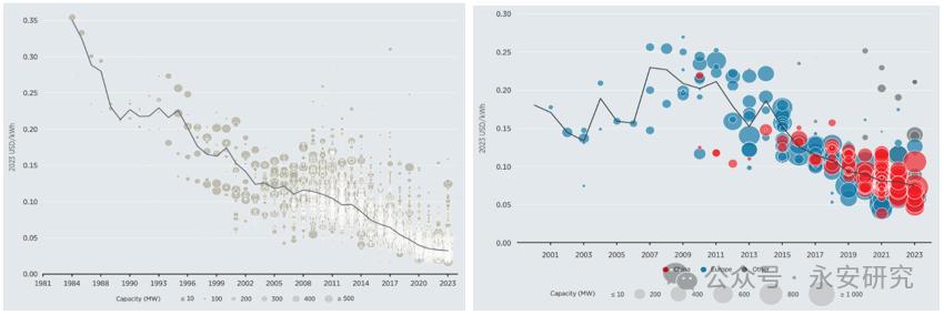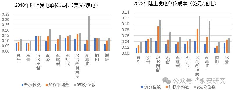 圖3、全球陸上與海上風(fēng)力度電成本(美元/度電)