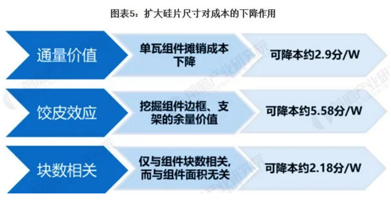 隨著硅片尺寸的擴(kuò)大,新型組件可以通過增加少量的硅片成本,獲得更高的組件端成本節(jié)約,進(jìn)而提升大尺寸組件的產(chǎn)品競爭力。其降本機(jī)理為: