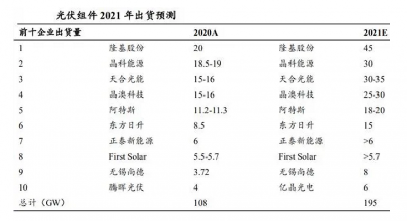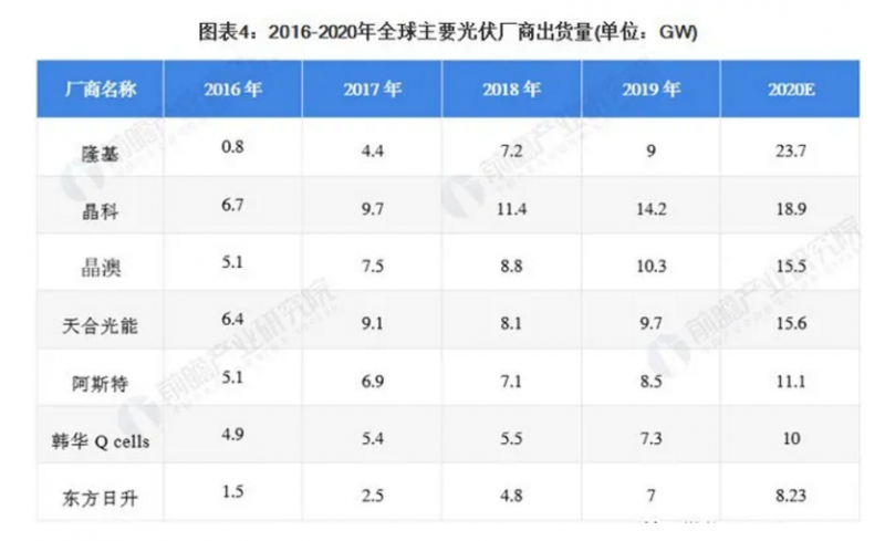 圖表2:我國光伏組件發(fā)展階段2016-2020年,全球主要廠商的組件出貨量不斷提升。2020年,隆基股份組件出貨量約為23.7GW,同比2019年增長163.33%,躍升至行業(yè)首位。同時(shí),晶科、晶澳等龍頭組件廠商的出貨量也實(shí)現(xiàn)了超過30%的增長。廠商擴(kuò)張產(chǎn)能主要為滿足下游光伏裝機(jī)容量的增加。