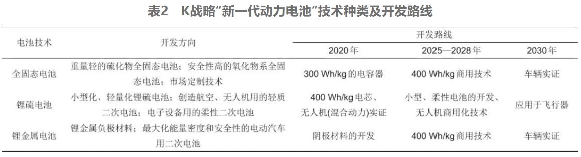 圍繞下一代動(dòng)力電池技術(shù),韓國(guó)政府將拉動(dòng)公私合作,支持大規(guī)模電池研發(fā)。K戰(zhàn)略中,韓國(guó)政府對(duì)研發(fā)路線進(jìn)行了規(guī)劃,主要圍繞新一代電池制造技術(shù)以及實(shí)現(xiàn)全固態(tài)電池、鋰硫電池、鋰金屬電池的商用化,如表2所示。