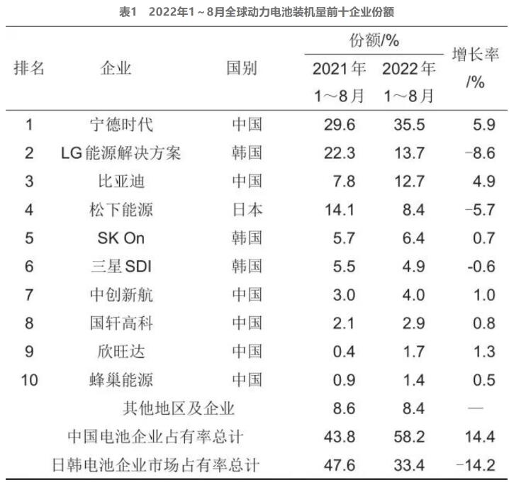 2015年以來(lái),在新能源汽車產(chǎn)業(yè)迅速發(fā)展和“雙碳”目標(biāo)等的帶動(dòng)下,我國(guó)動(dòng)力電池產(chǎn)業(yè)取得了快速的發(fā)展,并在全球電池市場(chǎng)占據(jù)領(lǐng)先地位。在全球電池市場(chǎng)中,中國(guó)、韓國(guó)、日本三個(gè)國(guó)家占據(jù)了90%以上的市場(chǎng)份額,形成了三足鼎立的局面。2022年1~8月,在全球動(dòng)力電池裝機(jī)量前十名企業(yè)中,中國(guó)企業(yè)有6家,共占58.2%的市場(chǎng)份額;韓國(guó)企業(yè)3家,日本企業(yè)1家,日韓企業(yè)合占33.4%的市場(chǎng)份額;歐洲和美國(guó)占較少的份額,約為2%。中國(guó)電池企業(yè)的市場(chǎng)份額持續(xù)增長(zhǎng),而日韓電池企業(yè)的市場(chǎng)份額呈現(xiàn)下降趨勢(shì),LGEnergy Solution(排名第二,以下簡(jiǎn)稱LGES)市場(chǎng)份額從2021年的22.3%下滑至13.7%;松下能源(排名第四)市場(chǎng)份額從14.1%下滑至8.4%;三星SDI(排名第六)市場(chǎng)份額從5.5%下滑至4.9%;僅SK On(排名第五)市場(chǎng)份額從5.7%上升至6.4%。