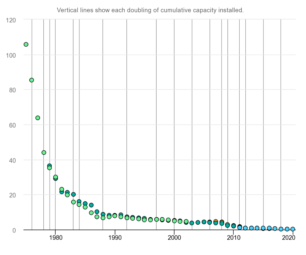 1975年,光伏的裝機(jī)成本高達(dá)105.7美元(2015年幣值,以下均同)/W,1990年,全球光伏發(fā)電量僅有91GWh。