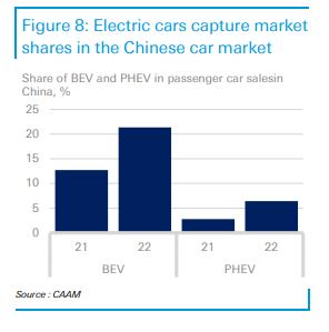 去年,電動(dòng)汽車在中國(guó)的市場(chǎng)份額繼續(xù)擴(kuò)大。純電動(dòng)汽車在乘用車總銷量中的份額從2021年的12.7%擴(kuò)大到2022年的21.3%,而插電式混合動(dòng)力汽車的市場(chǎng)份額從2.8%增加到6.4%,增長(zhǎng)了一倍多。