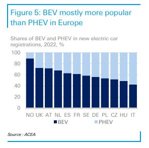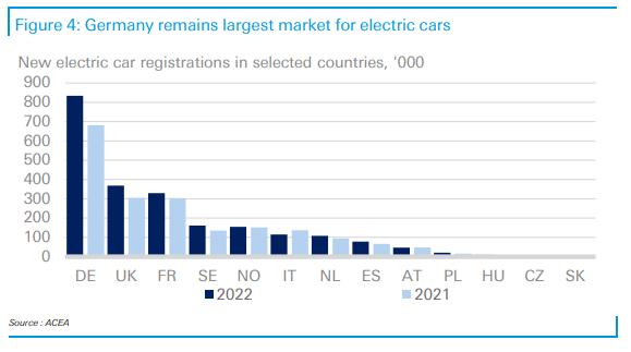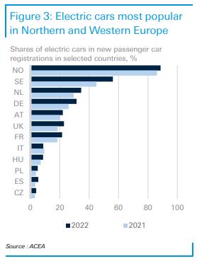 在歐洲,電動(dòng)汽車增長(zhǎng)勢(shì)頭強(qiáng)勁,2022年純電動(dòng)汽車和插電式汽車市場(chǎng)份額為22.9%。在北歐,新注冊(cè)電動(dòng)汽車的市場(chǎng)份額最高。電動(dòng)汽車在東歐和南歐的市場(chǎng)份額仍然不足。購(gòu)買價(jià)格高、收入低以及充電基礎(chǔ)設(shè)施不發(fā)達(dá)是造成這種情況的原因。