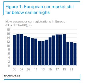 在需求方面,歐洲消費(fèi)者的購(gòu)買情緒最初受到疫情的抑制。自2022年以來(lái),能源價(jià)格上漲、通脹問(wèn)題以及利率上升對(duì)歐洲汽車消費(fèi)也產(chǎn)生了負(fù)面影響。此外,全球供應(yīng)鏈出現(xiàn)了中斷,這抑制了全球乘用車生產(chǎn)。