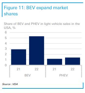 電動(dòng)汽車在美國(guó)仍是一個(gè)小眾市場(chǎng),但美國(guó)的監(jiān)管框架有所改善。與整體市場(chǎng)相比,德國(guó)品牌在美國(guó)電動(dòng)汽車市場(chǎng)的份額相當(dāng)高,2022年為11%。