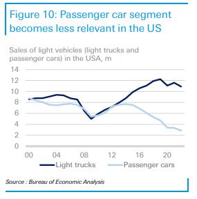 2022年,輕型車銷量(包括輕型卡車和乘用車)在美國(guó)下降了8%,約為1380萬(wàn)輛。利率上升、供應(yīng)鏈持續(xù)中斷和燃料價(jià)格上漲是造成這一現(xiàn)象的主要因素。前幾年,輕型車的銷量已經(jīng)呈下降趨勢(shì)。新冠肺炎疫情導(dǎo)致2020年美國(guó)市場(chǎng)大幅下滑,至今仍未復(fù)蘇。
