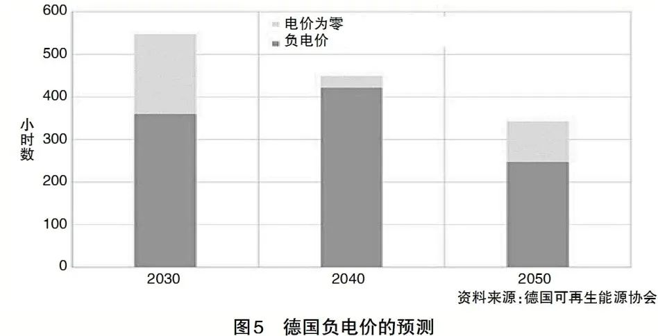 然而,負(fù)電價(jià)問題在德國(guó)能源市場(chǎng)中仍然持續(xù)存在。盡管德國(guó)對(duì)傳統(tǒng)電廠進(jìn)行了系統(tǒng)化靈活性改造,但按照德國(guó)可再生能源協(xié)會(huì)的預(yù)測(cè),到2030年德國(guó)仍將面臨300多小時(shí)的負(fù)電價(jià)情況,且這種狀況有可能直到2050年仍將維持在相同的水平(詳見圖5),主要原因是能源系統(tǒng)的靈活性仍未能達(dá)到要求,盡管預(yù)期將有大規(guī)模的儲(chǔ)能和靈活負(fù)荷投入使用。