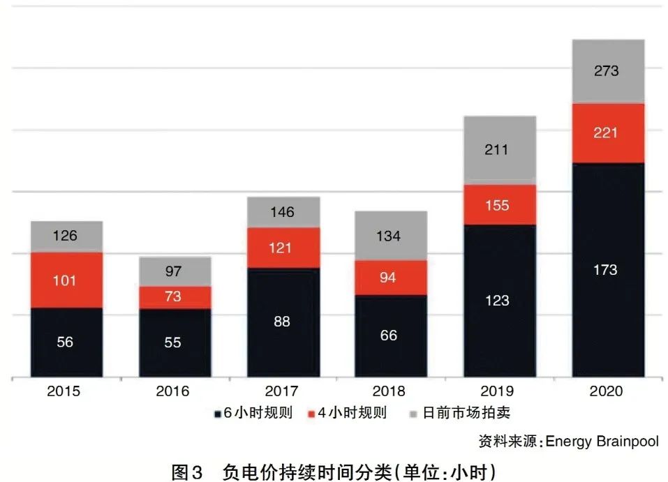 德國(guó)的研究發(fā)現(xiàn),負(fù)電價(jià)以持續(xù)6小時(shí)居多。因此,德國(guó)政府制定了相應(yīng)的限制措施,例如,如果現(xiàn)貨市場(chǎng)價(jià)格出現(xiàn)長(zhǎng)達(dá)6小時(shí)或更長(zhǎng)時(shí)間的負(fù)電價(jià),可再生能源的市場(chǎng)及管理補(bǔ)貼將會(huì)被取消。而法國(guó)對(duì)于負(fù)電價(jià)持續(xù)的時(shí)間上限規(guī)定則是20小時(shí)。(見圖3)
