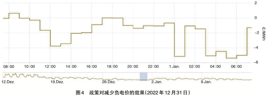 到2023年初,為避免負(fù)電價(jià)超過規(guī)定時(shí)間,可再生能源運(yùn)營(yíng)商開始采取預(yù)防性減少發(fā)電量,以免失去市場(chǎng)和管理補(bǔ)貼。這一現(xiàn)象進(jìn)一步證實(shí),政策的靈活性對(duì)于減少負(fù)電價(jià)起到了明顯的作用(詳見圖4)。