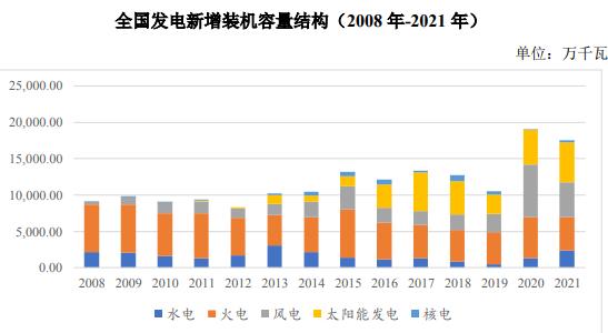 從總量和增速上看,近年來全國發(fā)電裝機(jī)容量逐年增長。2021 年,全國新增發(fā)電裝機(jī)容量 17,908 萬千瓦,比上年少投產(chǎn) 1,236 萬千瓦。其中火電新增 4,939萬千瓦(煤電為 2,937 萬千瓦,氣電為 771 萬千瓦),比上年下降 12.7%;核電新增 340 萬千瓦,比上年增長 203.9%;風(fēng)電新增 4,765 萬千瓦,比上年下降 33.9%;太陽能發(fā)電新增 5,454 萬千瓦,比上年增長 13.1%。