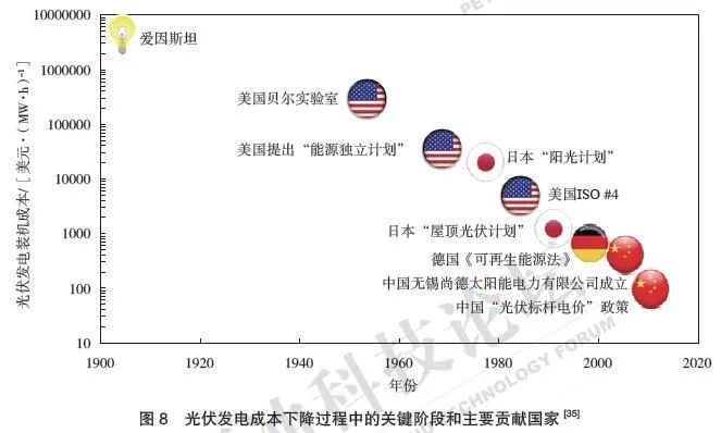 美國能源技術(shù)和公共政策學(xué)者Gregory F. Nemet于2019年出版著作《光伏如何變得便宜》(How Solar Became Cheap),書中介紹了光伏發(fā)電技術(shù)在歷史上的不同發(fā)展階段、成本變化的關(guān)鍵驅(qū)動因素、關(guān)鍵國家對成本降低的貢獻,以及光伏發(fā)電對其他低碳能源技術(shù)發(fā)展的經(jīng)驗?zāi)P?。光伏發(fā)電的4個關(guān)鍵階段為:(1)20世紀(jì)50—70年代美國早期實驗室研究,推動每兆瓦時的裝機成本從10萬美元級降到1萬美元級;(2)20世紀(jì)90年代的日本“屋頂光伏計劃”,推動每兆瓦時裝機成本降至1000美元級;(3)21世紀(jì)初德國《可再生能源法》的發(fā)布實施,推動裝機成本降至1000美元/(MW·h)以下;(4)中國以“光伏標(biāo)桿電價”等強力政策推動產(chǎn)業(yè)發(fā)展,促進裝機成本降至100美元/(MW·h)以內(nèi)(圖8)。