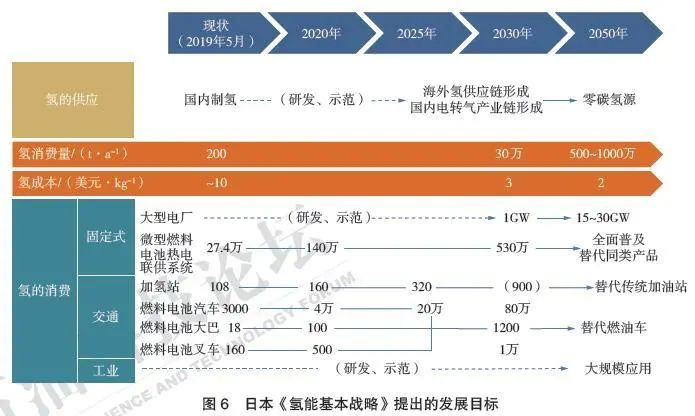在能源消費方面,2012—2016年,日本能源消費總量減少了6.1%,接近實現(xiàn)2030年節(jié)能目標(biāo)所需的平均速度。日本能源轉(zhuǎn)型以氫能規(guī)模化利用為顯著特色和重要抓手,將氫能與電力和熱能并列定位為核心二次能源,并提出建設(shè)“氫能社會”的愿景,希望通過氫燃料電池實現(xiàn)氫能在家庭、工業(yè)、交通甚至全社會領(lǐng)域的應(yīng)用。日本在《氫能基本戰(zhàn)略》提出的主要發(fā)展目標(biāo)詳見圖6。