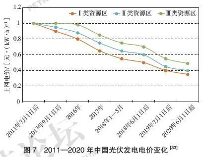 近年來,在全球可再生能源成本迅速下降的過程中,除了政策支持和技術(shù)進步以外,產(chǎn)業(yè)規(guī)模經(jīng)濟和規(guī)模效益是不容忽視的重要推力。中國得益于較為完備的基礎(chǔ)工業(yè)體系和龐大的市場,在推動風(fēng)電、光伏發(fā)電、生物質(zhì)發(fā)電、動力電池、氫能利用等產(chǎn)業(yè)發(fā)展過程中,發(fā)揮了巨大的規(guī)模經(jīng)濟優(yōu)勢。2013年以來,在國家政策的大力支持下,中國光伏發(fā)電產(chǎn)業(yè)不斷擴大規(guī)模,迅速發(fā)展為全球最大的市場,同時也擺脫了困擾光伏產(chǎn)業(yè)多年的“兩頭在外”的尷尬局面。2013—2018年,中國光伏裝機容量達(dá)到1.74×108kW,年復(fù)合增長率超過73%,較2012年的0.065×108kW增長26 倍。光伏發(fā)電上網(wǎng)電價從2011年的1元/(kW·h),下降到2020年的0.35~0.49 元/(kW·h)(2020年6月1日開始實施)(圖7)。在這一過程中,國內(nèi)涌現(xiàn)出一批優(yōu)秀的光伏企業(yè),在2019全球光伏企業(yè)20強排行榜上有16家中國公司,前10名中有7家中國公司。