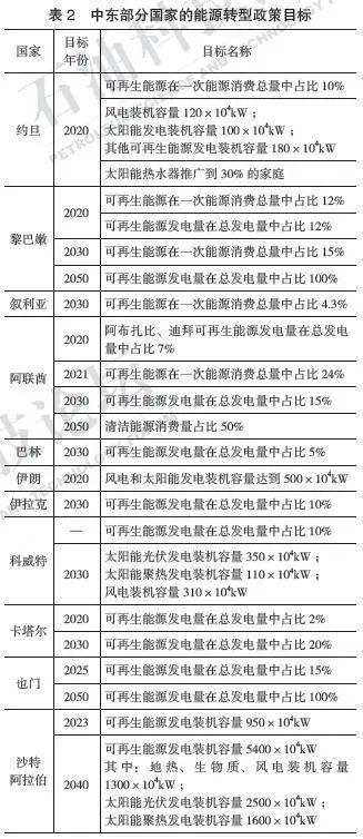 21世紀(jì)以來,全球能源格局發(fā)生重大變化,以美國頁巖氣革命為代表的非常規(guī)油氣開采量爆發(fā)式增長,可再生能源產(chǎn)業(yè)高速發(fā)展,全球能源消費中心不斷向發(fā)展中國家轉(zhuǎn)移。這些因素促使中東國家對后石油時代進行戰(zhàn)略思考。近年來,推進能源轉(zhuǎn)型、擴大可再生能源應(yīng)用比例逐步進入政府部門的視野,沙特阿拉伯、阿聯(lián)酋、卡塔爾、科威特等國相繼制定了多項政策目標(biāo)(表2)。