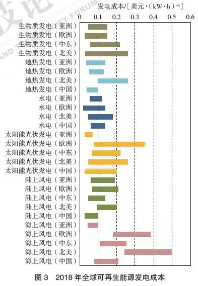 第三,可再生能源大規(guī)模開發(fā)利用。風(fēng)力發(fā)電和太陽能光伏發(fā)電成為全球成本下降最快、平均成本最低的可再生能源發(fā)電方式。2018年,除海上風(fēng)電以外,全球各地多種可再生能源發(fā)電技術(shù)的成本開始具備較強的成本競爭力(圖3)。在許多國家和地區(qū),可再生能源已開始了對化石能源發(fā)電的存量替代。中國是世界上可再生能源利用規(guī)模最大、平均成本最低的國家,從2014年開始,每年的風(fēng)電和太陽能發(fā)電量均超過全社會新增用電量。