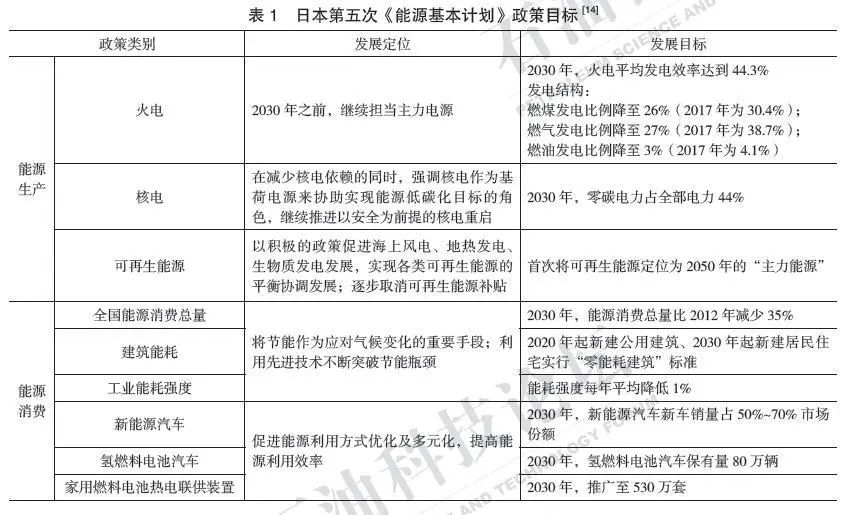 日本能源消費高度依賴進口,能源自給率低于10%,是發(fā)達(dá)國家中能源自給率最低的國家之一。日本能源轉(zhuǎn)型戰(zhàn)略的主要思路不拘泥于能源自給率,著力通過能源技術(shù)優(yōu)勢彌補資源稟賦的劣勢,將能源技術(shù)能力作為保障能源安全、穩(wěn)定能源供給、優(yōu)化能源結(jié)構(gòu)和提高產(chǎn)業(yè)競爭力的戰(zhàn)略性手段。2018年,日本發(fā)布了第五次《能源基本計劃》,提出了能源轉(zhuǎn)型戰(zhàn)略的新目標(biāo)、新路徑和新方向(表1)。