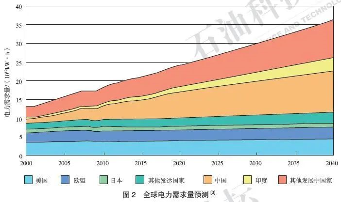 第二,現(xiàn)有能源利用系統(tǒng)變革,電力、氫能等二次能源消費規(guī)模不斷擴大。電力在終端能源消耗中所占的比例已從2000年的16%,增長到2018年的20%。國際可再生能源署(IRENA)認(rèn)為,全球電力需求量將持續(xù)高速增長,2050年,電力在終端能源消費中所占比例將提高到49%左右。國際能源署認(rèn)為,全球電力需求的增長在發(fā)達(dá)國家和發(fā)展中國家將表現(xiàn)出兩條截然不同的路徑:在發(fā)達(dá)國家,電力需求增長將被數(shù)字化和電氣化技術(shù)進步帶來的能效全面提升所抵消;在發(fā)展中國家,家庭收入的增長、工業(yè)規(guī)模的擴大和服務(wù)業(yè)的發(fā)展正在有力地推動電力需求增長,按照既定政策,預(yù)計2019—2040年,發(fā)展中國家對全球電力需求增長的貢獻接近90%(圖2)。